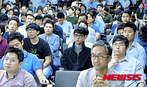 【서울=뉴시스】박문호 기자 = 24일 오후 서울 강남구 선릉로 은행권청년창업재단 디캠프에서 매달 마지막 주 금요일 열리는 스타트업을 위한 데뷔 무대 '디데이(D.DAY)' 참석자들이 발표를 경청하고 있다.