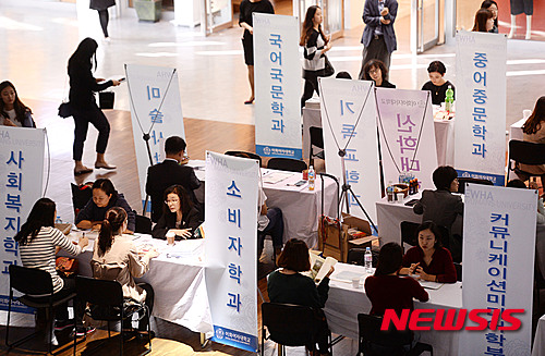 【서울=뉴시스】 장세영 기자 = 6일 오전 서울 이화여자대학교 ECC 다목적홀에서 열린 '제10회 이화여자대학교 대학원 전공박람회'에서 학부생들이 전공분야 대학원 입학전형에 대해 상담하고 있다. 2015.10.06.