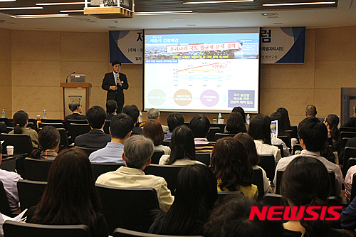 【서울=뉴시스】8일 세종시 한국법제연구원 대회의실에서 열린 '입법정책포럼'에 참석한 이춘희 세종시장이 '국가균형발전을 선도하는 세종시의 미래, 그리고 법적 과제'를 주제로 발제하고 있다. 2015.10.08. (사진=한국법제연구원 제공)