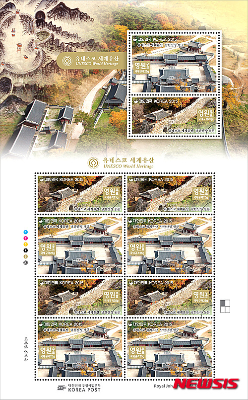 【서울=뉴시스】우정사업본부(본부장 김기덕)는 유네스코 세계유산 우표를 시리즈로 매년 발행, 올해는 그 첫 번째로 남한산성을 소재로 우표 2종 총 100만장, 소형시트 12만장을 오는 29일 발행한다고 28일 전했다. 2015.10.28. (사진=우정사업본부 제공)