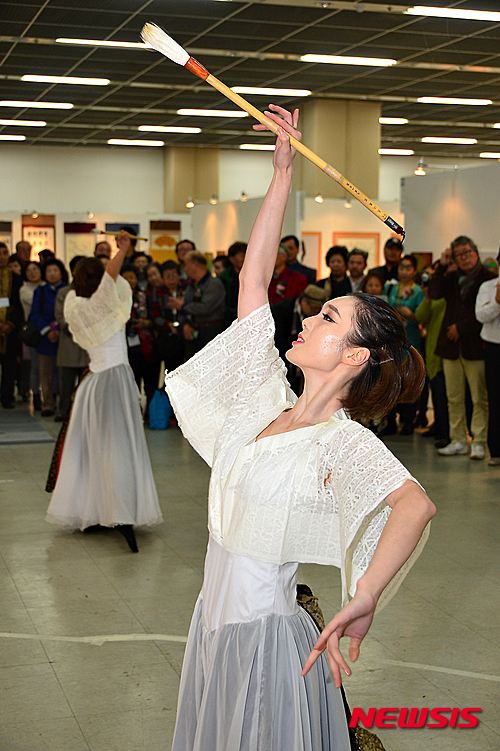 【청주=뉴시스】인진연 기자 = 28일 오후 충북 청주문화산업단지 상상마루에서 열린 동아시아 문자문화 페스티벌 개막 행사로 중국 북경수도체육대학 출신의 마소남(MA XIAO NAN)과 웨이란(WEI RAN)이 필무를 선보이고 있다. 2015.10.28