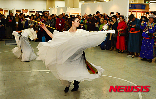 【청주=뉴시스】인진연 기자 = 28일 오후 충북 청주문화산업단지 상상마루에서 열린 동아시아 문자문화 페스티벌 개막 행사로 중국 북경수도체육대학 출신의 마소남(MA XIAO NAN)과 웨이란(WEI RAN)이 필무를 선보이고 있다. 2015.10.28