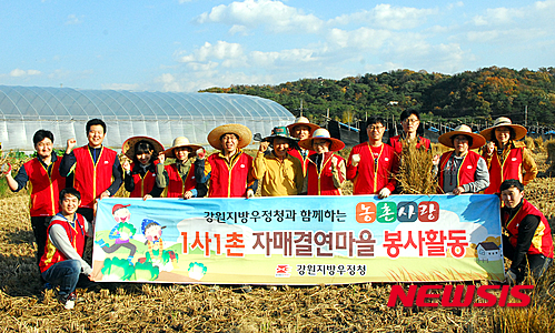 【원주=뉴시스】김영준 기자 = 28일 강원지방우정청 임직원 20여명은 일손부족으로 어려움을 겪고 있는 1사1촌 자매결연 마을인 원주시 호저면 매호리를 방문해 농촌일손돕기 봉사활동을 펼쳤다. 2015.10.28. (사진=강원지방우정청 제공)
