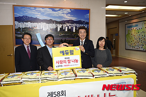 【서울=뉴시스】김성환 노원구청장이 29일 서울 노원구청에서 열린 에듀윌 사랑의 쌀 전달식에 참석해 남영택 에듀윌 전략마케팅본부장에게서 쌀을 전달받고 참석자들과 기념촬영을 하고 있다. 2015.10.29. (사진=노원구 제공)