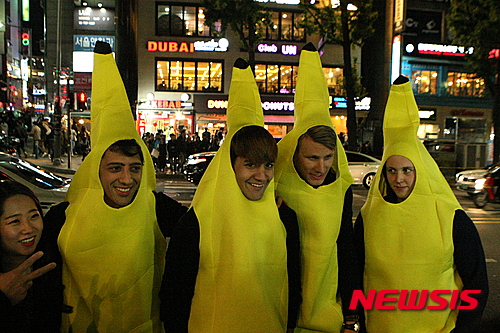 【서울=뉴시스】조명규 기자 = 31일 오후 서울 용산구 이태원에서 외계인 복장을 입은 외국인들이 포즈를 취하고 있다. 2015.10.31.