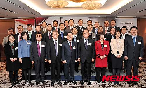 【서울=뉴시스】한국중견기업연합회는 11일 오전 서울 중구 소공동 롯데호텔에서 방하남 한국노동연구원장을 초청해 '한국의 노사 관계 현안 및 선진화 방안'을 주제로 제162회 Ahpek INSIGHTS 강연회를 개최했다. 왼쪽 첫줄 다섯번째 부터 반원익 한국중견기업연합회 상근부회장, 방하남 한국노동연구원장. 2015.11.11. (사진=한국중견기업연합회 제공)