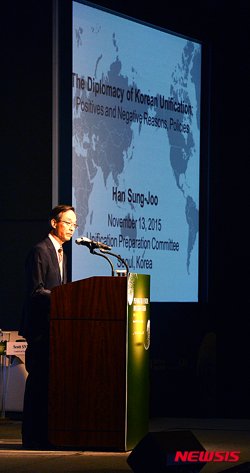 【서울=뉴시스】박주성 기자 = 한승수 전 외교부 장관이 13일 오전 서울 웨스틴 조선호텔에서 열린 한반도 평화통일을 위한 국제협력 컨퍼런스에서 기조연설을 하고 있다. 2015.11.13.