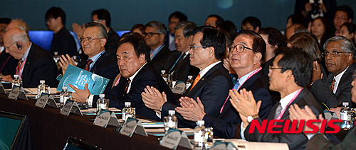 【서울=뉴시스】박주성 기자 = 정의화 국회의장과 정종욱 대통령직속 통일준비위원회 민간 부위원장을 비롯한 내빈들이 13일 오전 서울 웨스틴 조선호텔에서 열린 한반도 평화통일을 위한 국제협력 컨퍼런스에서 한승주 전 외교부장관의 기조연설을 들으며 박수를 치고 있다. 2015.11.13.