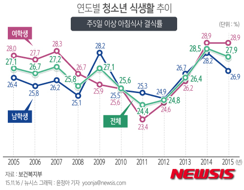 【서울=뉴시스】윤정아 기자 = 16일 보건복지부가 발표한 '제 11차(2015년) 청소년 건강행태온라인 조사' 결과에 따르면 올해 주 5일 이상 아침식사 결식하는 학생은 10명 중 3명인 27.9%로 나타났다.