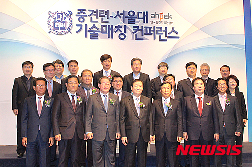 【서울=뉴시스】고승민 기자 = 한국중견기업연합회는 17일 서울대학교 호암 컨벤션센터에서 ‘제1회 중견련·서울대학교 기술매칭 컨퍼런스’를 개최했다. 사진은 강호갑 중견련 회장 등 내빈들이 기념촬영하는 모습. 2015.11.17. (사진=한국중견기업연합회 제공)