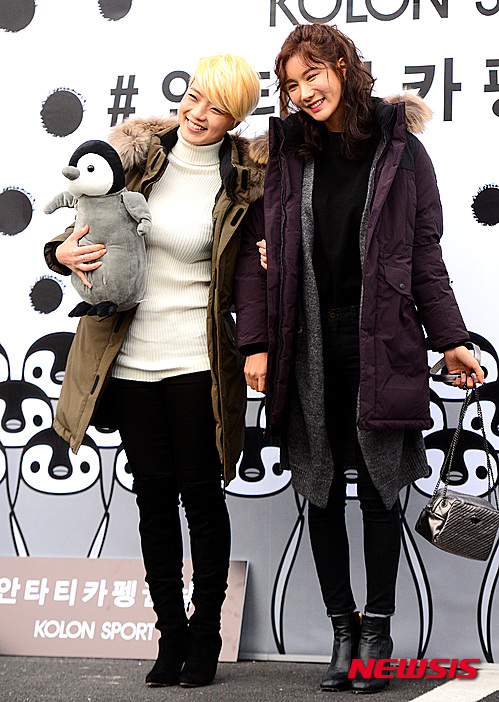 【서울=뉴시스】박영태 기자 = 24일 오후 서울 광진구 자양동 커먼그라운드에서 진행된 코오롱스포츠 ‘안타티카 펭귄 날다’ 캠페인 기념 포토월에서 방송인 안영미와 걸그룹 애프터스쿨의 정아가 포즈를 취하고 있다. 2015.11.24.