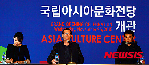 【광주=뉴시스】류형근 기자 = 25일 오후 광주 동구 국립아시아문화전당 프레스룸에서 ACT 참여작가 독일의 요하임 사우터 작가와 서진석 아시아 창작공간 대표가 기자회견을 하고 있다. 2015.11.25.