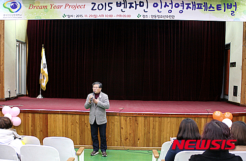 【서울=뉴시스】벤자민인성영재학교(교장 김나옥) 경북학습관은 지난 29일 경북 안동시청소년수련관에서 '벤자민 인성영재 페스티벌 & 학교설명회'를 개최했다. 이재갑 안동시의원이 축사를 하고 있다. 2015.11.30. (사진=벤자민인성영재학교 제공)