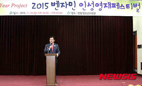 【서울=뉴시스】벤자민인성영재학교(교장 김나옥) 경북학습관은 지난 29일 경북 안동시청소년수련관에서 '벤자민 인성영재 페스티벌 & 학교설명회'를 개최했다. 손광영 안동시의원이 축사를 하고 있다. 2015.11.30. (사진=벤자민인성영재학교 제공)