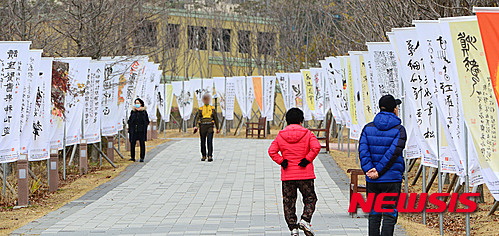 【부산=뉴시스】 하경민 기자 = 2일 오전 부산시민공원에서 '2015 부산서예비엔날레'가 개막한 가운데 시민들이 공원 내 전포천에 전시된 세계 서화(서예+문인화) 깃발 작품 169점을 구경하고 있다.