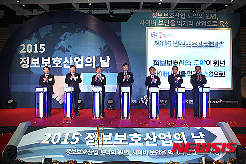 【서울=뉴시스】최진석 기자 = 최양희 미래창조과학부 장관이 9일 저녁 서울 영등포구 전경련회관에서 열린 '2015 정보보호산업의 날 기념식'에서 세레모니를 하고 있다.