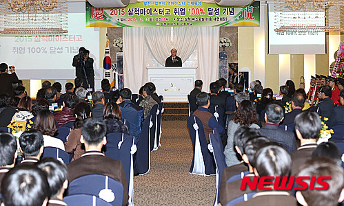 【삼척=뉴시스】홍춘봉 기자 = 김양호 강원 삼척시장은 15일 삼척 씨스포빌에서 열린 삼척마이스터고 취업 100% 달성 기념식에서 인사말을 하고 있다. 2015.12.15. (사진=삼척시 제공)