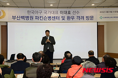 【부산=뉴시스】제갈수만 기자 = 인제대학교 부산백병원은 한국야구 국가대표 이대호 선수가 지난 16일 부산백병원에서 진행하는 파킨슨병 무료건강강좌에 방문해 파킨슨병 환자들에게 위로와 격려의 말을 전하는 시간을 가졌다고 17일 밝혔다. 2015.12.17. (사진=부산백병원 제공)