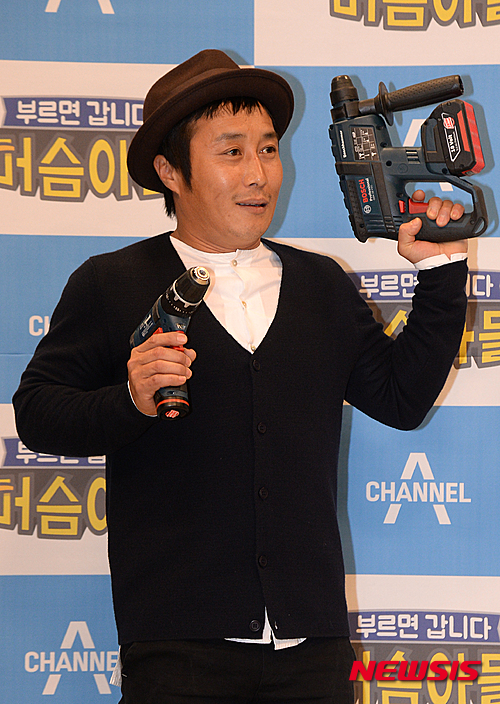 【서울=뉴시스】장세영 기자 = 개그맨 김병만이 18일 오후 서울 마포구 상암동 동아디지털미디어센터 4층 스튜디오에서 열린 채널A 리얼노동버라이어티 머슴아들 기자간담회에서 공구를 들고 포토타임을 갖고 있다.