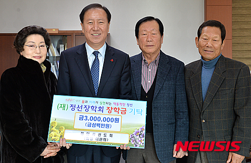 【정선=뉴시스】홍춘봉 기자 = 강원 정선군 고한읍 정암사 신도회 이관희 회장일행은 연말을 맞아 30일 정선장학회를 방문해 전정환 이사장(정선군수)에게 지역인재 육성을 위해 써달라며 장학금 300만원을 기탁고 있다. 2015.12.30. (사진=정선군 제공)