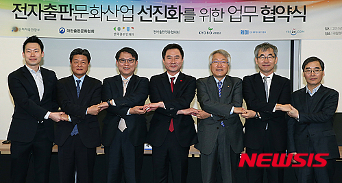 왼쪽부터 배기식 리디 대표이사, 김기호 예스24 대표이사, 허정도 교보문고 대표이사, 박민권 문화체육관광부 제1차관, 고영수 대한출판문화협회 회장, 윤철호 한국출판인회의 회장, 홍영태 전자출판진흥협의회 회장. 2015.12.30. (사진=문화체육관광부 제공)