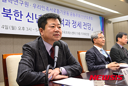 【서울=뉴시스】조성봉 기자 = 4일 오후 서울 중구 프레스센터에서 열린 2016년 북한 신년사 분석과 정세전망 신년 토론회에서 통일연구원 김갑식북한연구실장이 발표를 하고 있다.