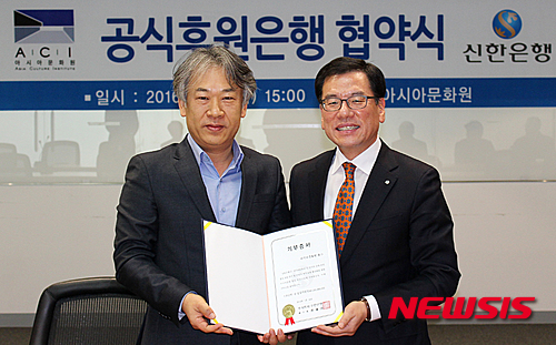 【광주=뉴시스】배동민 기자 = 아시아문화원과 신한은행은 14일 오후 국립아시아문화전당 대회의실에서 아시아문화원 공식후원은행 업무협약을 체결했다. 아시아문화원 김병석 원장(왼쪽)과 신한은행 윤상돈 부행장이 기념촬영을 하고 있다. 2016.01.14. (사진=아시아문화원 제공)