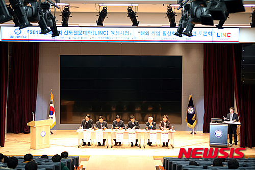 【창원=뉴시스】김기진 기자 = 창원문성대학교(총장 이원석) LINC사업단 주최로 '이공계 대학생 취업확대 토론회'가 15일 오후 교내 컨벤션홀에서 열리고 있다. 좌측부터 송부용 경남발전연구원 박사, 박종길 고용노동부 정책국장, 정대율 경상대학교 교수,조현옥 경상남도 고용정책단 사무관, 류병현 동구기업 대표, 박정호 창원문성대학교 교수. 2016.01.15. (사진=창원 문성대 제공)