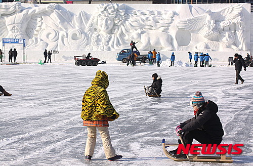 【화천=뉴시스】한윤식 기자 = 18일 오전 강원 화천에서 열리고 있는 산천어축제장을 찾은 어린이들이 얼음썰매를 타며 즐거워하고 있다.2016.01.18.
