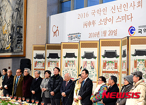 【서울=뉴시스】권현구 기자 = 20일 오후 서울 서초구 서초동 국립국악원 예악당에서 열린 '2016년 국악원 신년인사회 병신년(丙申年) 소망이 스미다' 에서 박민권(오른쪽 다섯 번째) 문화체육관광부 1차관이 인사말을 하고 있다. 2016.01.20.