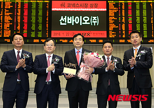 【서울=뉴시스】한국거래소 코스닥시장본부는 22일 오전 서울 여의도 서울사옥 홍보관에서 의약품 개발 및 제조업체인 선바이오의 코넥스시장 신규상장 기념식을 개최했다.