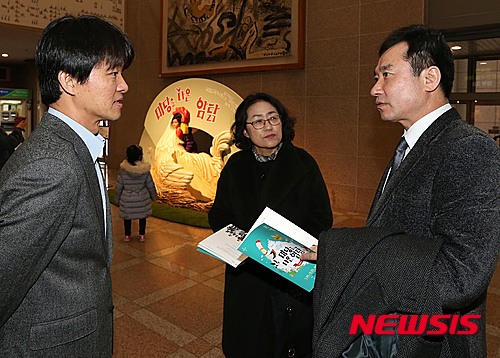 【서울=뉴시스】박민권 문화체육관광부 제1차관이 31일 서울 서초구 국립국악원에서 열리는 가족음악극 ‘마당을 나온 암탉’을 관람하기 앞서 김해숙 국악원장 등 관계자와 이야기를 나누고 있다. 2016.01.31. (사진=문화체육관광부 제공)