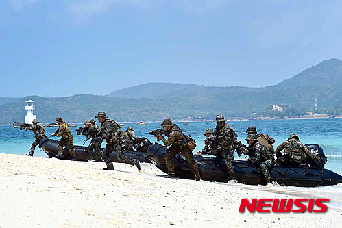 【서울=뉴시스】태국에서 열린 코브라골드 훈련에 참가한 해군 UDT 장병들이 13일 태국 라타위에 위치한 해병대 수색부대 훈련장에서 고속고무보트를 이용한 해안침투훈련을 하고 있다. 2016.02.14. (사진=해병대사령부 제공)