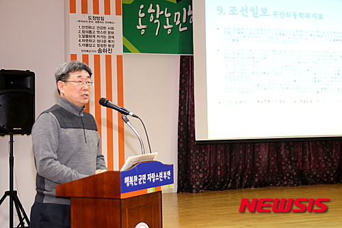 【부안=뉴시스】김종효 기자 = 18일 오후 전북 부안군에서 열린 '동학농민혁명 백산대회 재조명 학술연구용역 최종보고회', 용역을 맡아 수행한 ㈔한국역사문화원의 성주현 원장(청암대 교수)이 백산대회의 실체적 진실에 대해 설명하고 있다. 2016.02.18.