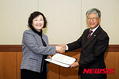 【대전=뉴시스】이시우 기자 = 기초과학연구원(IBS) 김두철 원장(사진 오른쪽)과 한국과학기술정보연구원(KISTI) 한선화 원장(왼쪽)은 23일 KISTI 대전 본원에서 기초과학·계산과학 분야 공동연구 수행 및 학술적·인적 교류 협력을 위한 업무협력 협정을 체결했다. 이번 협정을 통해 다양한 기초과학분야의 거대 규모 데이터 처리를 초고성능 컴퓨팅 인프라를 활용해 해결할 수 있을 것으로 기대된다. 2016.2.23. (사진=IBS 제공)