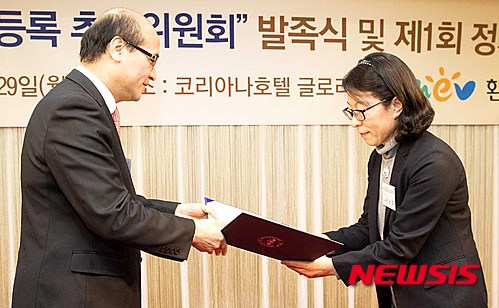 【서울=뉴시스】고범준 기자 = 정연만 환경부 차관(왼쪽)이 29일 오후 서울시 중구 세종대로 코리아나 호텔에서 열린 화학물질 공동등록 추진위원회 발족식에 참석해 위원들에게 위촉장을 수여하고 있다. 2016.02.29. (사진=환경부 제공)