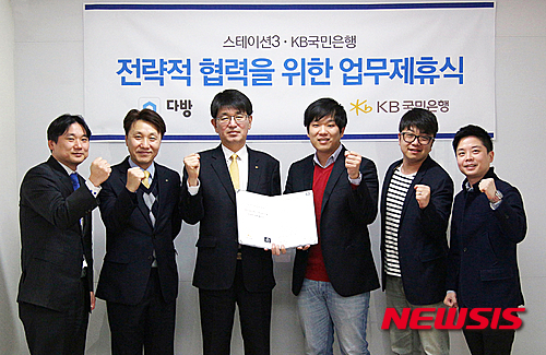 【서울=뉴시스】강대명 KB국민은행 미래채널본부 본부장과 한유순 스테이션3 대표가 29일 서울 강남구 역삼동에서 전략적 제휴를 체결한 뒤 기념촬영을 하고 있다. 2016.02.29. (사진=KB국민은행 제공)