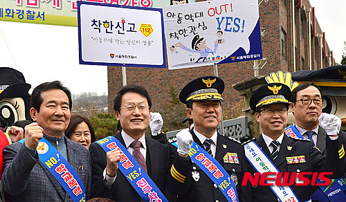 【서울=뉴시스】김선웅 기자 = 2일 오전 서울 종로구 서울사대 부설초등학교 앞에서 열린 학교폭력 예방활동 켐페인에서 정세균(왼쪽) 더불어민주당 의원과 조희연(왼쪽 두 번째) 서울시교육감이 경찰 관계자들과 기념촬영을 하고 있다. 2016.03.02.