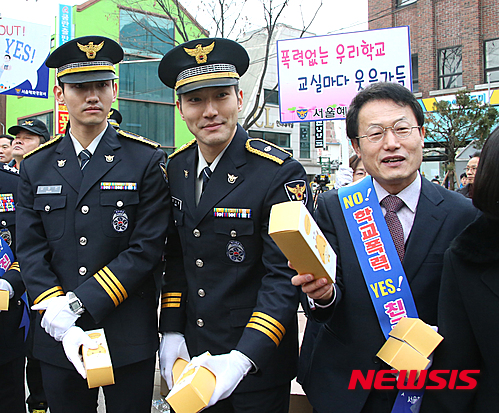 【서울=뉴시스】조희연(오른쪽) 서울시교육감이 2일 오전 서울 종로구 서울대학교 사범대학 부설초등학교와 서울사대부여중 정문에서 의경홍보단인 최강창민(왼쪽), 최시원과 '등굣길 학교폭력 예방 캠페인'을 펼치고 있다. 2016.03.02. (사진=서울시교육청 제공)