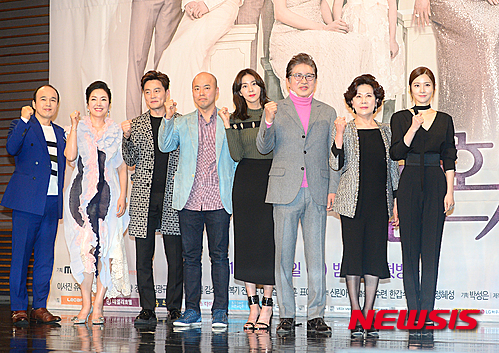 【서울=뉴시스】김동민 기자 = 3일 오후 서울 마포구 상암 MBC 골든마우스홀에서 열린 주말특별기획 ‘결혼계약(극본 정유경, 연출 김진민)’ 제작발표회에서 배우 김광규(왼쪽부터), 이휘향, 이서진, 김진민 PD, 배우 유이, 김용건, 박정수, 김유리가 사진 촬영을 하고 있다.