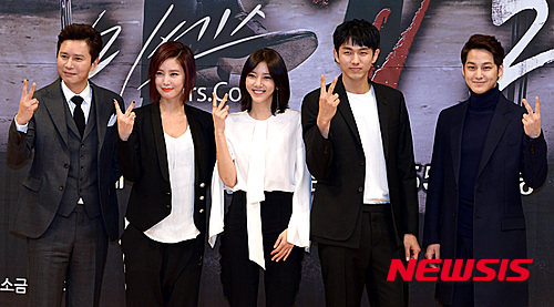 【서울=뉴시스】이영환 기자 = 4일 오후 서울 양천구 목동 SBS에서 열린 주말드라마 미세스 캅2(연출 유인식·김정현, 극본 황주하) 제작발표회에서 출연진들이 포즈를 취하고 있다. 왼쪽부터 배우 김민종, 배우 김성령, 가수 손담비, 가수 임슬옹, 배우 김범. 2016.03.04.