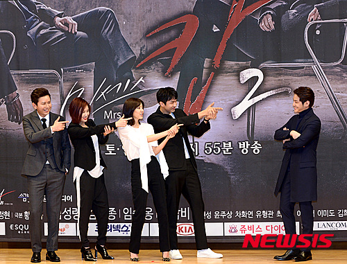【서울=뉴시스】이영환 기자 = 4일 오후 서울 양천구 목동 SBS에서 열린 주말드라마 미세스 캅2(연출 유인식·김정현, 극본 황주하) 제작발표회에서 출연진들이 포즈를 취하고 있다. 왼쪽부터 배우 김민종, 배우 김성령, 가수 손담비, 가수 임슬옹, 배우 김범. 2016.03.04.