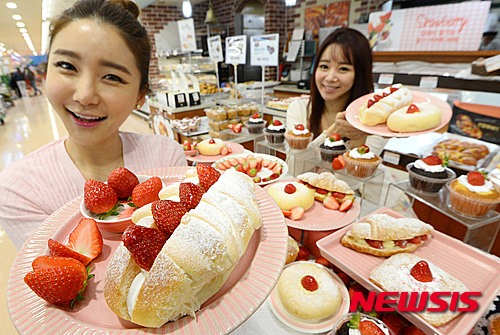 롯데마트는 다가오는 화이트데이를 맞아 제철 딸길 만든 달콤한 딸기 빵 6종을 출시, 오는 10일부터 일주일간 ‘딸기 초코/치즈 머핀’ 2300원, ‘딸기 크로와상’ 및 ‘딸기 퐁당 우유 크림 빵’ 각 2800원, ‘딸기 생크림 데니쉬’ 3000원, ‘딸기품은 생크림빵’ 3500원에 판매한다. 2016.03.08.
