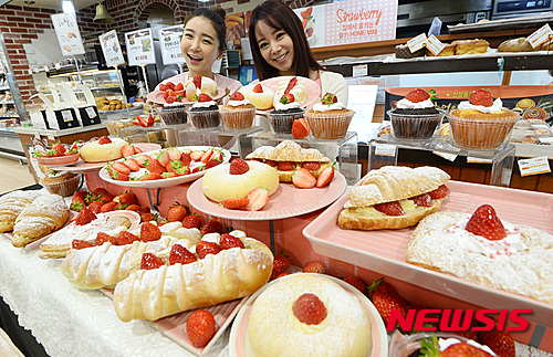 【서울=뉴시스】김진아 기자 = 롯데마트가 8일 서울 중구 롯데마트 서울역점 보네스뻬에서 달콤한 딸기 빵 6종을 선보이고 있다.