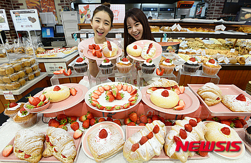 【서울=뉴시스】김진아 기자 = 롯데마트가 8일 서울 중구 롯데마트 서울역점 보네스뻬에서 달콤한 딸기 빵 6종을 선보이고 있다.