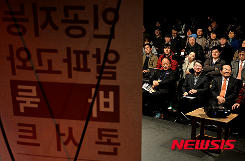 【서울=뉴시스】박진희 기자 = 9일 오후 서울 종로구 대학로 아름다운 극장에서 열린 '인공지능과 바둑 심포지움 콘서트'에서 이세돌-알파고 바둑 대국을 안철수(앞줄 가운데) 국민의당 공동대표와 정세균(앞줄 오른쪽) 더불어민주당 의원이 시민들과 함께 중계 방송을 관람을 하고 있다. 2016.03.09.