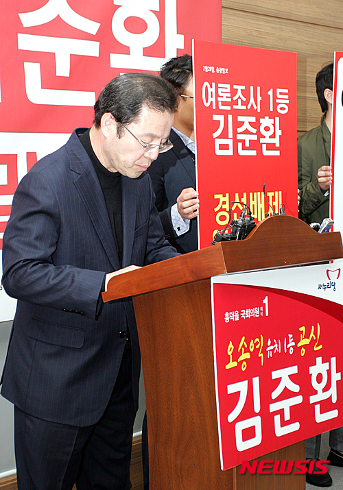 【청주=뉴시스】이병찬 기자 = 새누리당의 20대 총선 청주 흥덕 선거구 공천심사에서 컷오프된 김준환 변호사가 14일 충북도청 브리핑룸에서 탈당 후 무소속 출마 의사를 밝힌 뒤 유권자들에게 인사하고 있다.2016.03.14