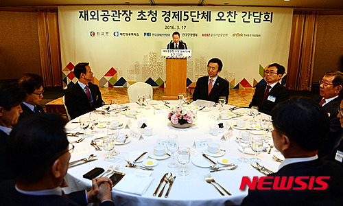 이날 간담회에는 윤병세 외교부 장관, 반원익 한국중견기업연합회 상근 부회장, 모철민 주프랑스 대사, 한국무역협회 김정관 상근부회장, 김장수 주중대사, 전국경제인연합회 이승철 상근부회장, 유흥수 주일본대사, 중소기업중앙회 송재희 상근부회장, 조현 주인도 대사 등이 참석했다. 2016.03.17.