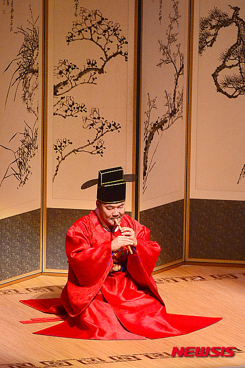 【서울=뉴시스】김선웅 기자 = 17일 오후 서울 서초구 국립국악원 예악당에서 중요무형문화재 제46호 피리정악 및 대취타 보존회 주최로 열린 '2016 피리정악 및 대취타 공개행사' 에서 나영선 국립민속국악원 지도단원이 피리를 연주하고 있다. 2016.03.17.