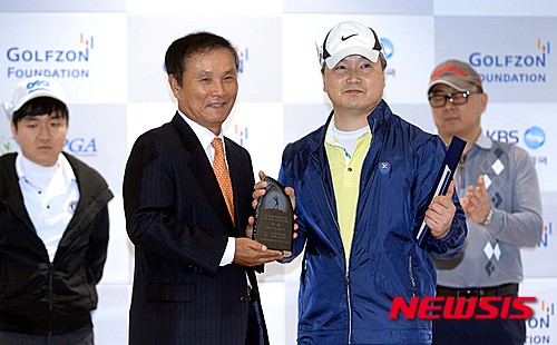 【대전=뉴시스】고승민 기자 = 21일 오전 대전광역시 유성구 골프존에서 열린 2016 골프존문화재단배 전국 장애인 스크린골프대회 시상식에서 개인 지체(복합)부문 우승을 차지한 이보상 선수가 김영찬 골프존문화재단 이사장으로부터 상패를 받고 기념촬영을 하고 있다. 2016.03.21.